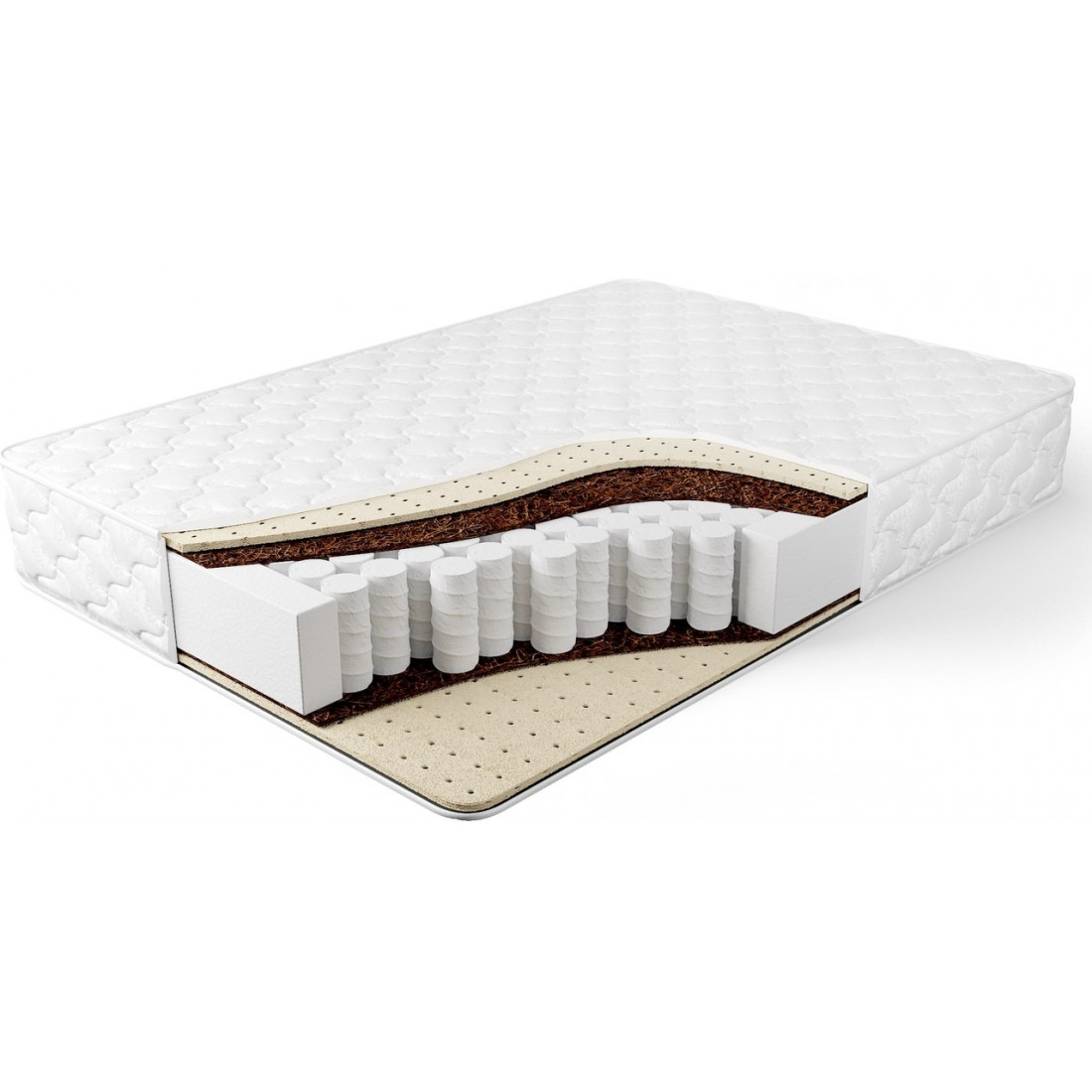 Наполнение: независимый блок TFK, высота блока 140 мм, латекс 20 мм с двух сторон, кокосовая плита 10 мм с двух сторон, усиление по периметру - короб из ортопены.