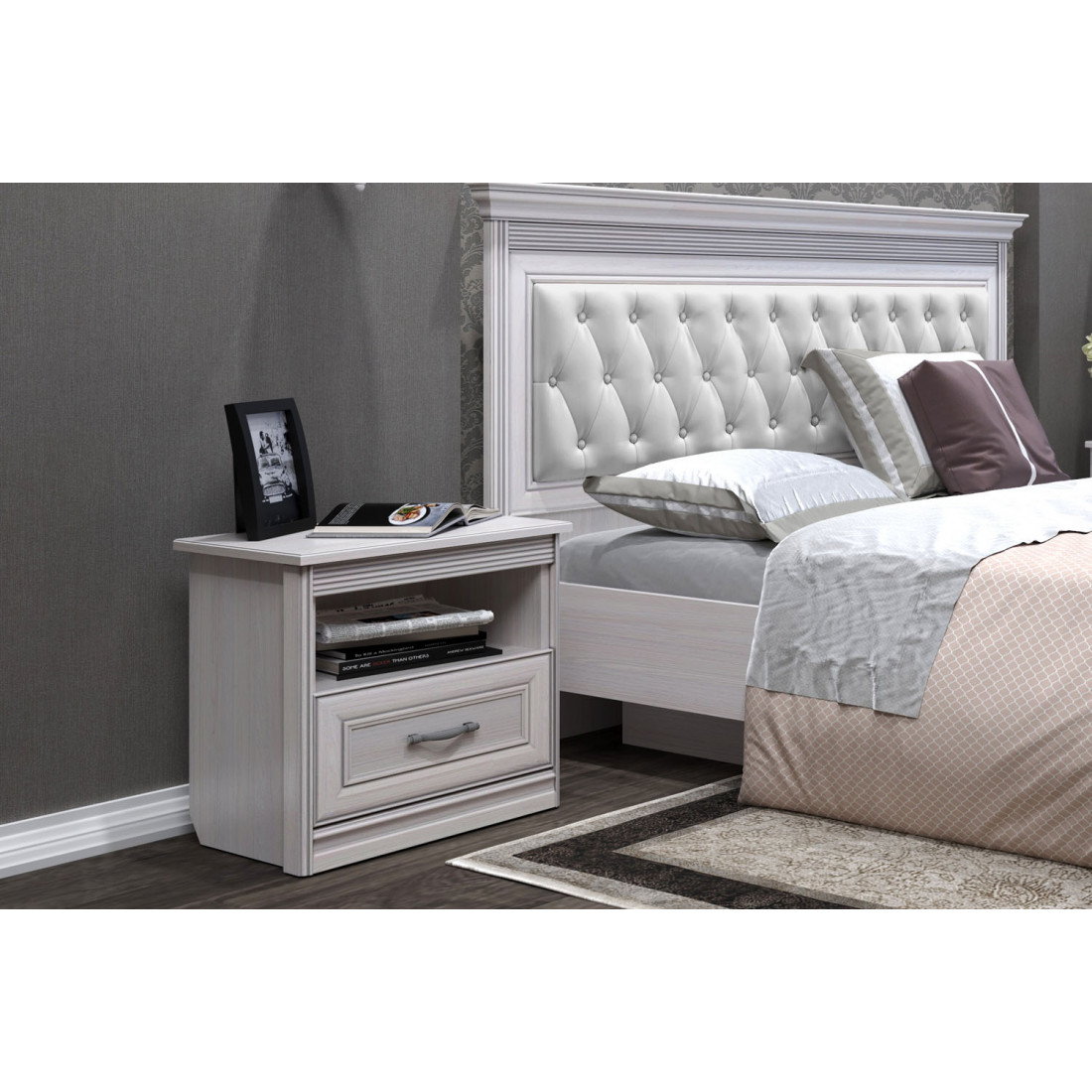 Спальня Неаполь 2 Ясень анкор светлый (патина "серебро") экокожа «polo» белая.